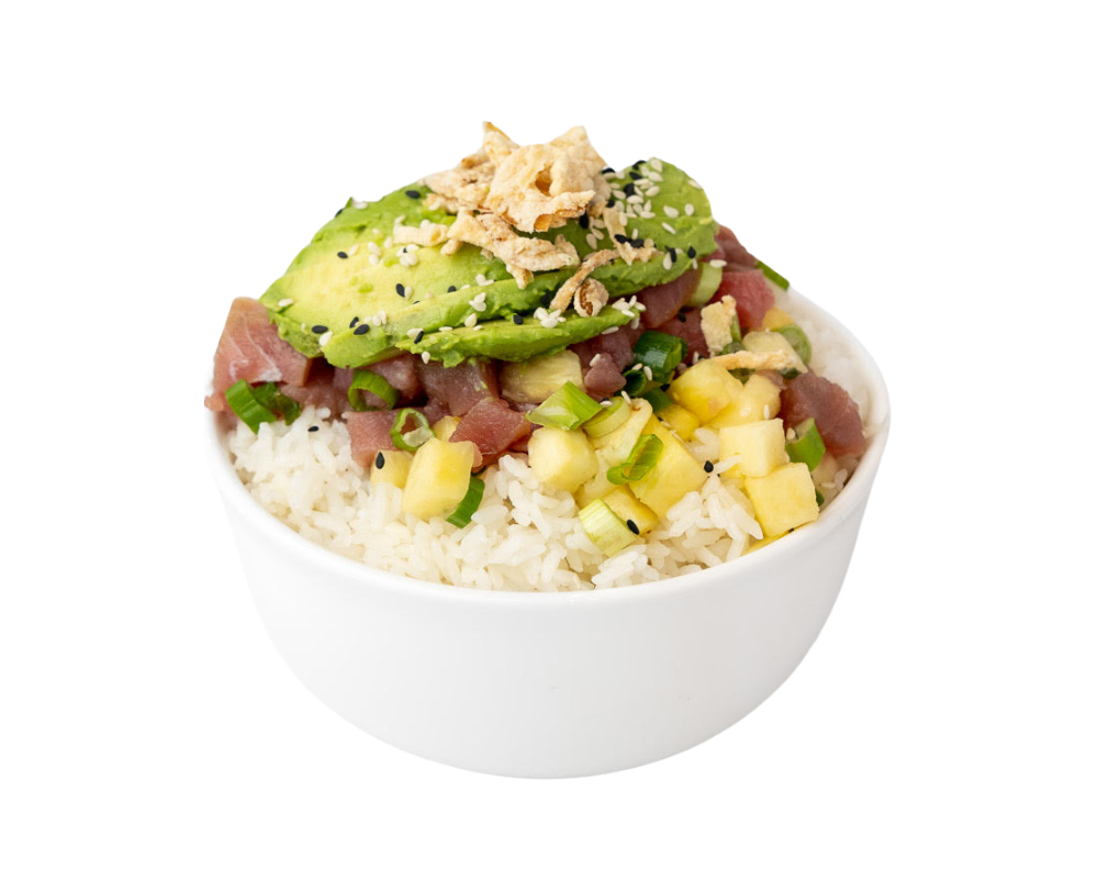 choice of protein ($+), white rice, pineapple, avocado, scallions, crispy onions, house-made, gluten/dairy free spicy shaka sauce. Crispy onions contain gluten.