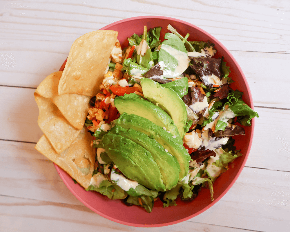 grilled BBQ chicken, mesclun mix, black beans, corn, red peppers, carrots, avocado, tortilla chips and kickin lime